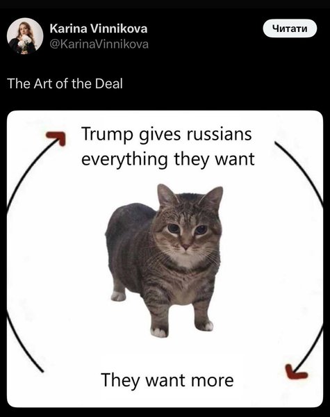 Также украинцы "визуализировали" искусство сделок Дональда Трампа. Таким образом сначала президент США предлагает россиянам все, что они хотят, а те впоследствии требуют еще больше.