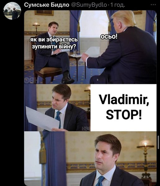 Кроме этого, украинцы представили, как президента США спрашивают на интервью, как тот планирует закончить войну РФ против Украины. На что Трамп предлагает эти два слова: "Владимир, остановись".