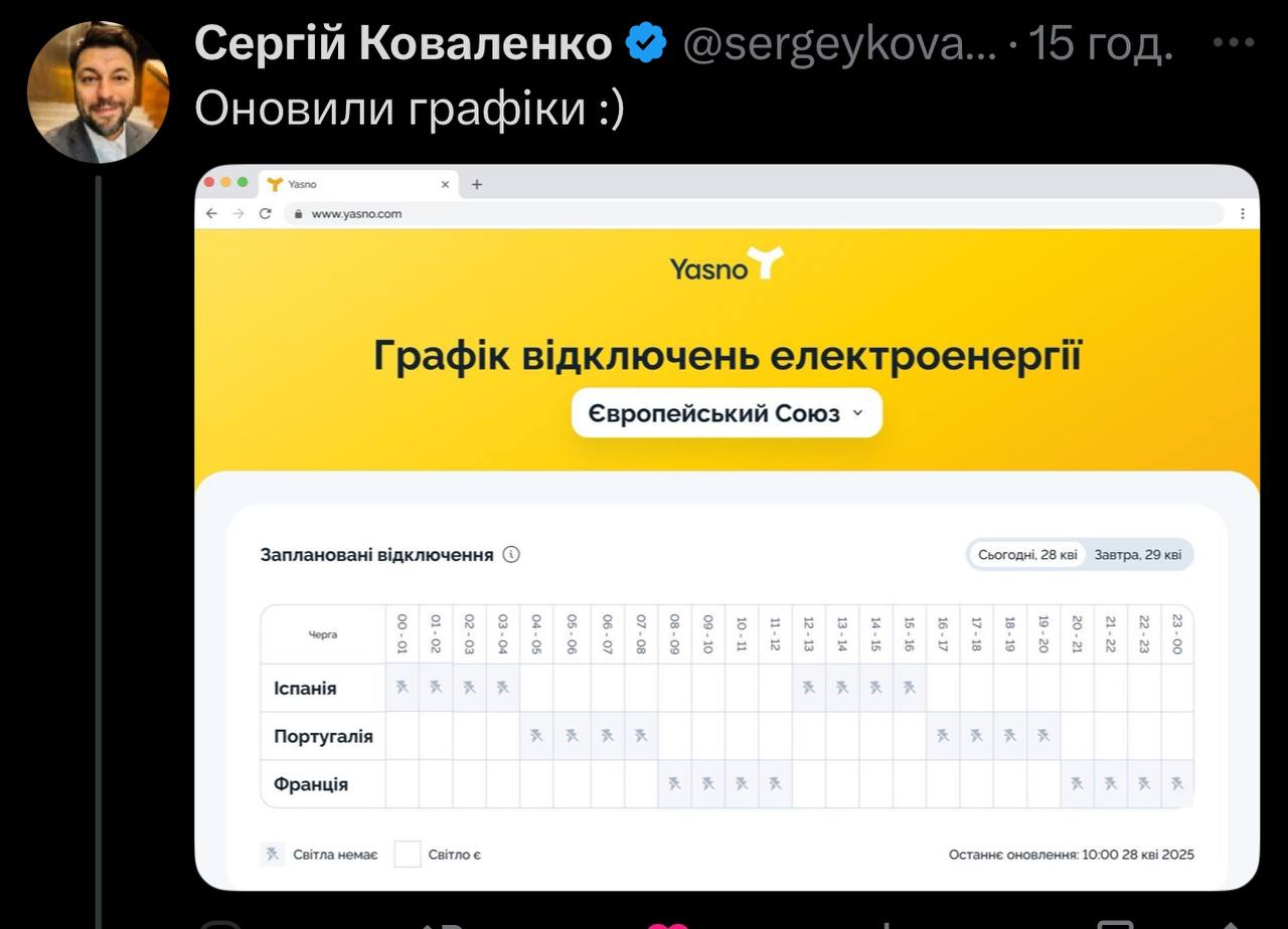 Между тем украинский поставщик электроэнергии YASNO подчеркнул, что это не они "выключили" Испанию и Португалию.