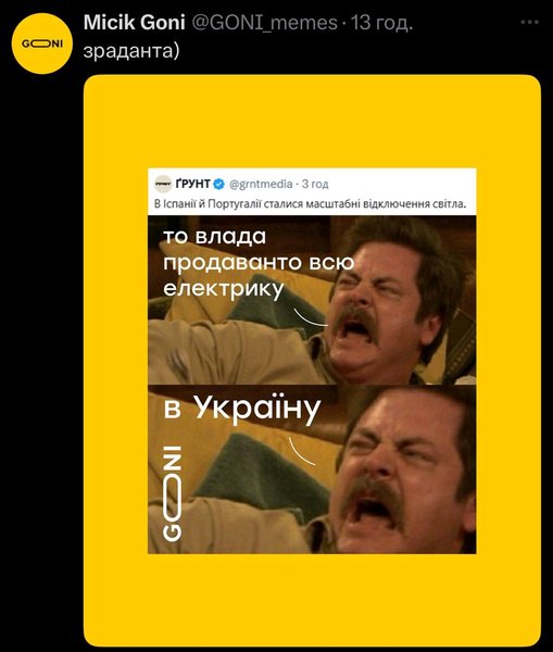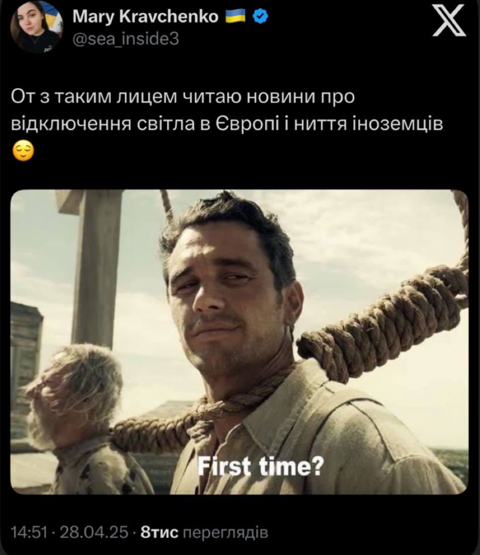 28 апреля в ряде стран Европы произошел масштабный блэкаут. В частности, без электроэнергии остались Испания, Португалия, часть Франции. Причиной называли вероятную кибератаку, а украинцы не смогли пройти мимо "близкой" темы и создали мемы.