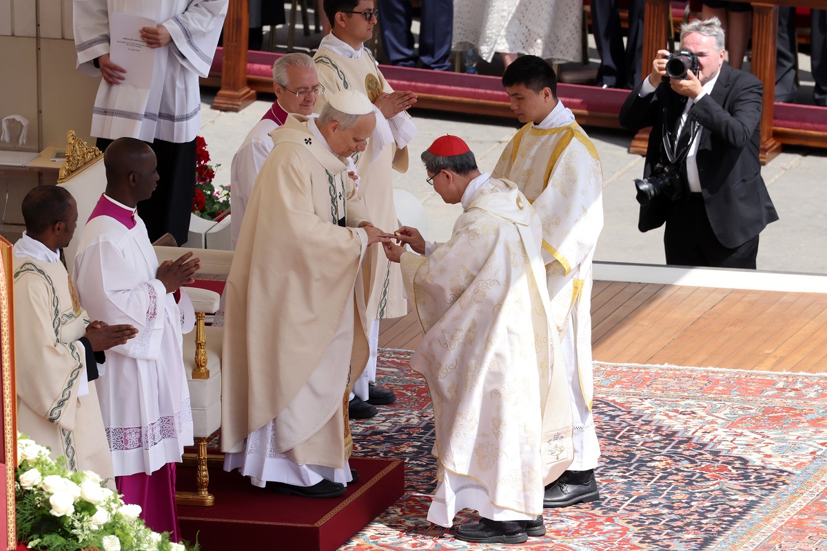 Представители Католической церкви почтили нового папу, включая трех первых кардиналов каждого сана (епископского, пресвитерского и диаконского); одного епископа, одного священника и одного диакона; два генеральных настоятеля (один мужчина и одна женщина); супружеская пара; и один мальчик и одна девочка (каждый конфирмован) с каждого континента.