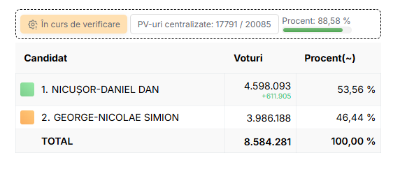 По данным ЦИК Румынии, уже обработано почти 88,58% бюллетеней по состоянию на 22:30. Сейчас лидерство в гонке сохраняет мэр Бухареста Никушор Дан — за него проголосовало почти 590 тыс. избирателей, чем за его оппонента.