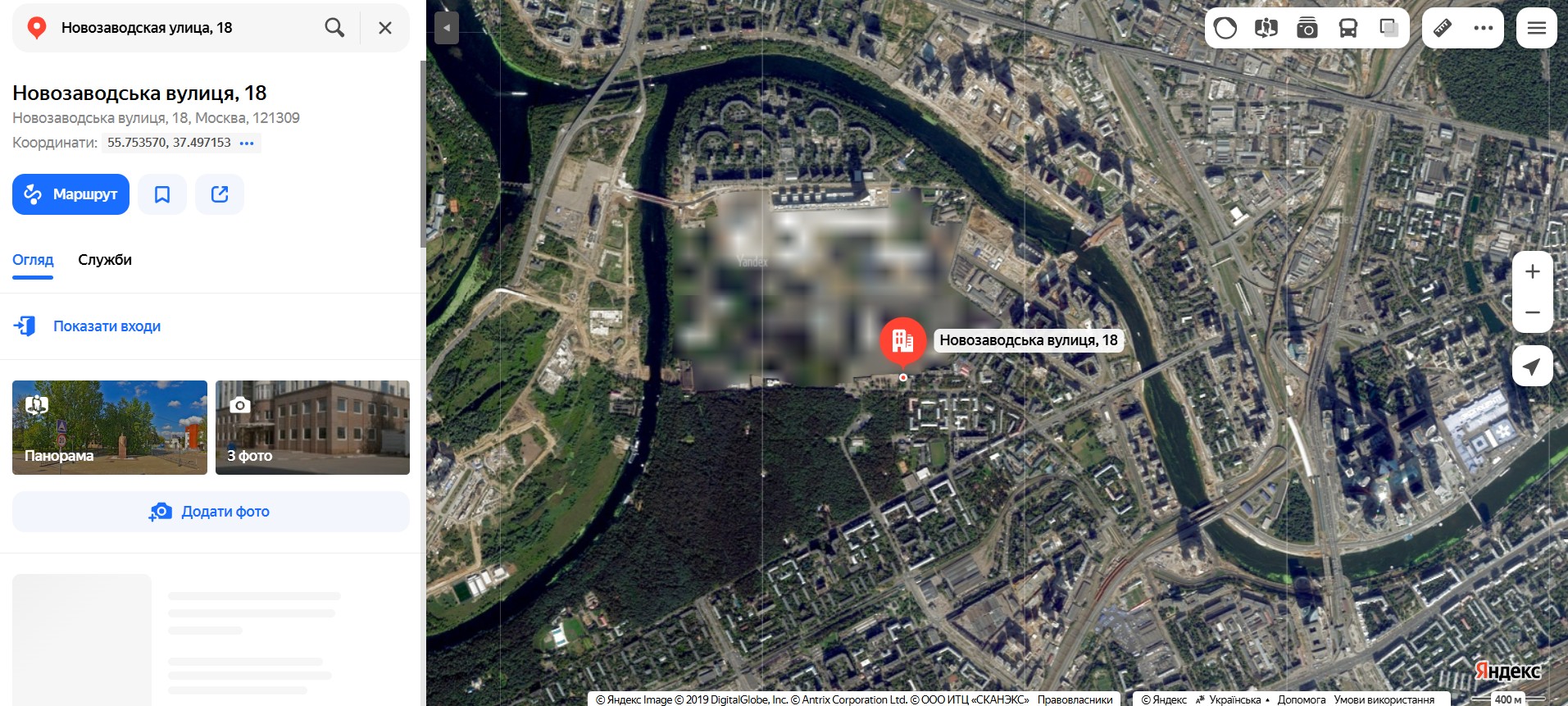 После ударов по РФ Яндекс размыл фото научного центра на ул. Новозаводская, 18, Москва