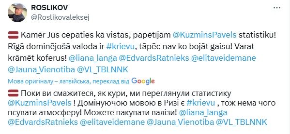 Алексей Росликов, лидер партии "Стабильность!", заявил 5 июня, что "русский язык – наш язык", а ранее рекомендовал своим оппонентам "собирать чемоданы" и не "портить атмосферу", так как в Риге преобладает русский. В Сейме по регламенту запрещены другие языки кроме латвийского.