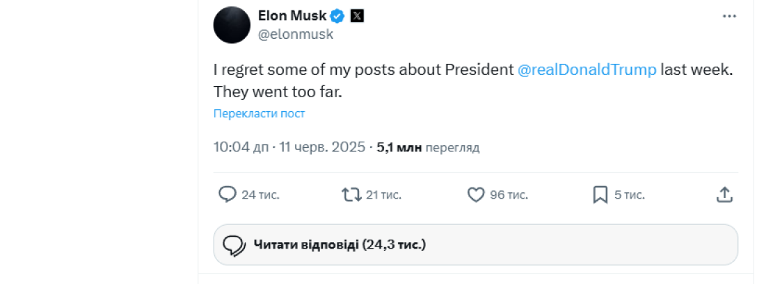 "Я жалею о некоторых своих постах о президенте Дональде Трампе на прошлой неделе. Они зашли слишком далеко", — говорится в заметке Маска.