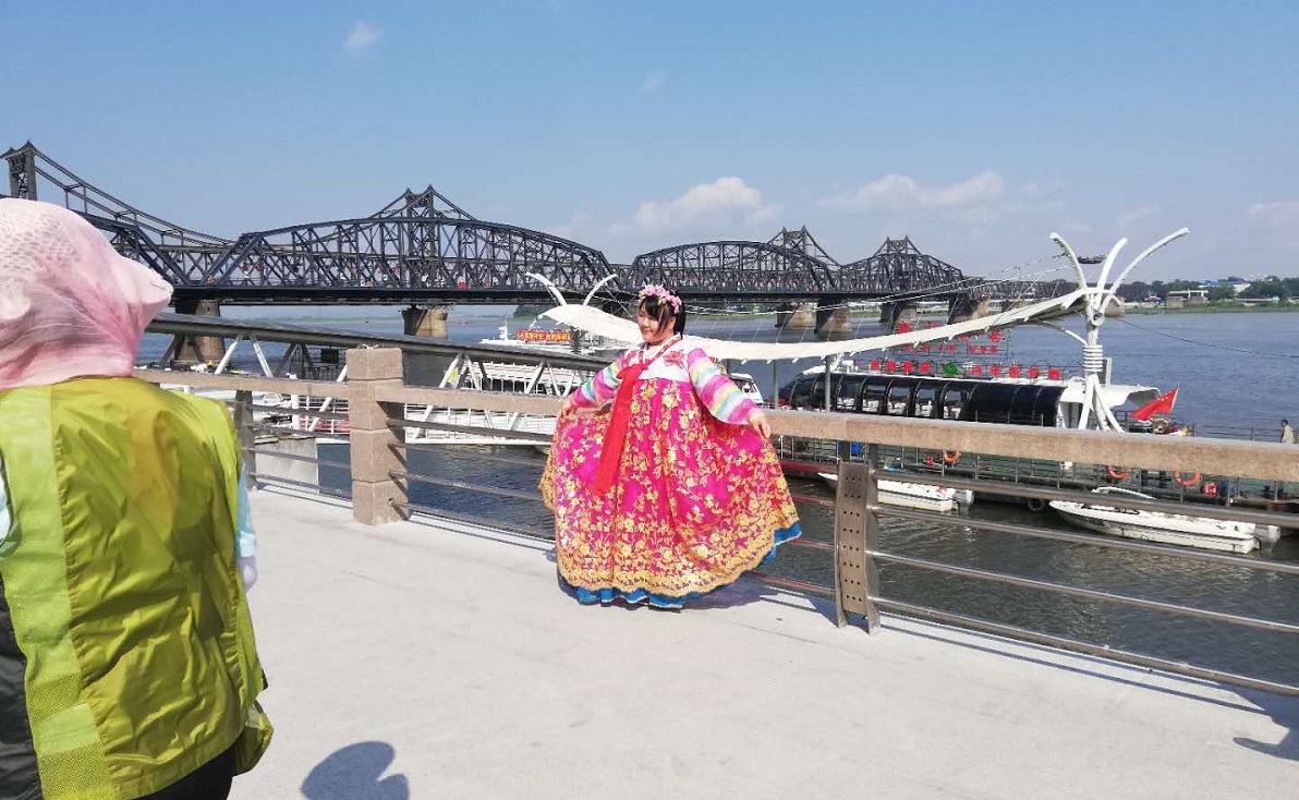 Туристы высаживаются на набережной города Даньдун, где через реку Ялуцзян перекинут мост китайско-корейской дружбы. Они фотографируются на фоне пустынного силуэта противоположного берега, с торговыми центрами и небоскребами процветающего города Даньдун в КНР. Торговцы предлагают традиционные корейские костюмы, магниты и спиртное, разлитое в бутылки в форме ручных гранат и ракет.