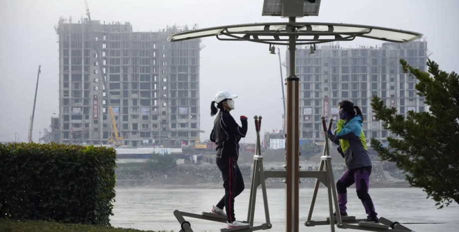 Мужчина одет в черную рабочую одежду и желтую каску и он занят работой, за ним высится необитаемый двенадцатиэтажный жилой дом. И туристы счастливы, что их 50 юаней окупились и им удалось увидеть жителя соседней страны.