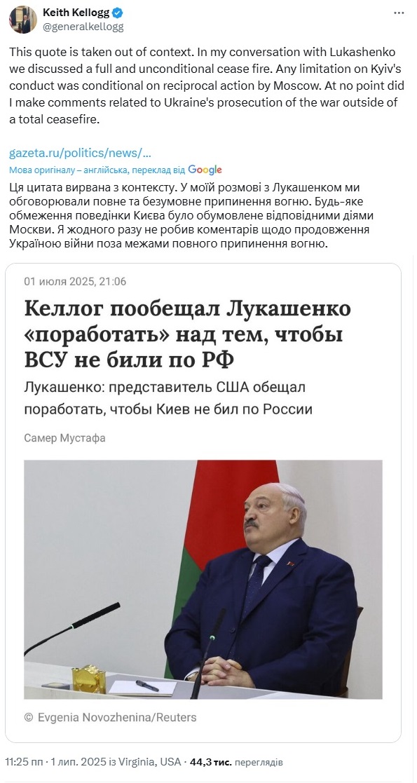 1 июля, российские и белорусские государственные СМИ распространили заявление Александра Лукашенко о том, что он передал Келлогу позицию российского диктатора Владимира Путина по возможному перемирию.
