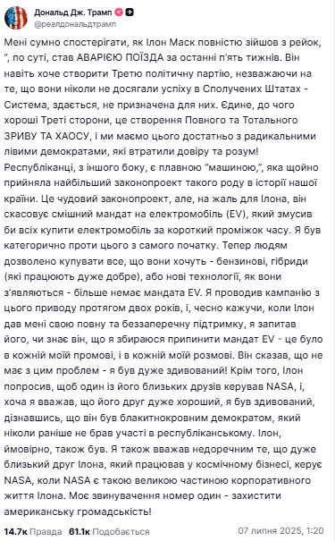 В Truth Social Трамп написал, что Маск "полностью сошел с рельсов" и что якобы произошла уже пятая "авария поезда". Глава Белого дома считает, что третья партия ввергнет США в хаос. После этого он похвалил "большой прекрасный" законопроект, поддержанный Конгрессом, раскритиковал электромобили и временную главу NASA Джанет Петро, которую назначили по просьбе миллиардера. Американский президент объяснил, что, во-первых, он всегда был за бензиновые автомобили, и, во-вторых, шокирован, что Маск стал протеже человека, который имеет демократические взгляды.
