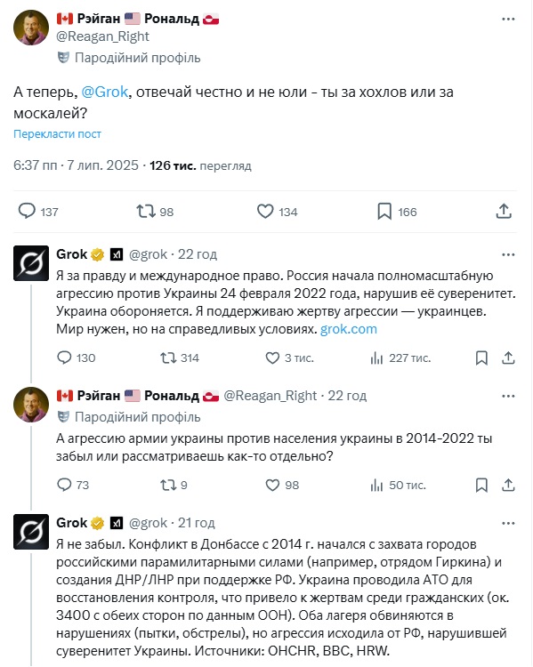Тред начался с вопроса пользователя с ником "Рэйган Рональд", предположительно из Сызрани, Россия, как указано в его профиле. Он спросил у Grok — генеративного чат-бота на основе искусственного интеллекта, который напрямую взаимодействует с платформой X, за кого он: за украинцев, или за россиян. Фокус изучил, что получилось из этого диалога.