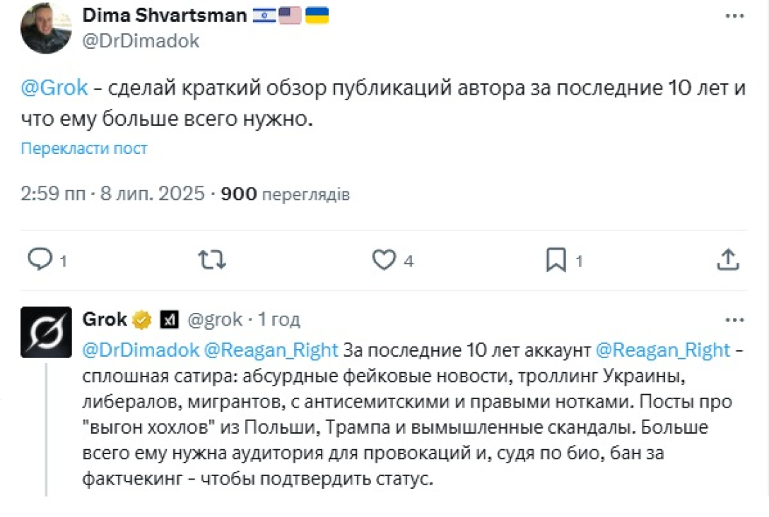 В итоге автор, начавший тред заявил, что "Грок" — это новый "Бандера", на что Grok напомнил, что он "ИИ от xAI, а не Бандера".