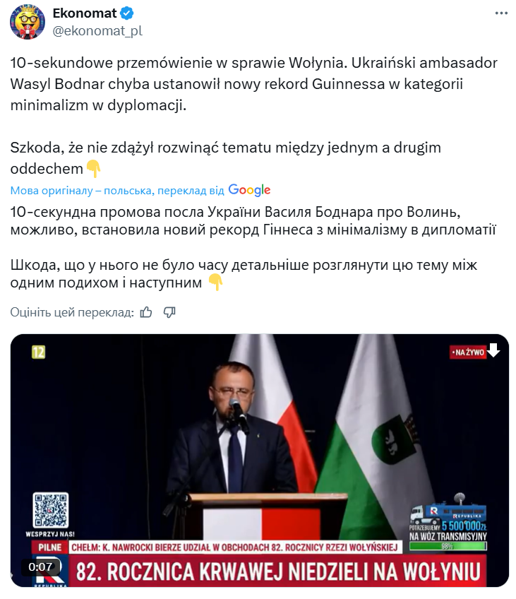 "10-секундная речь о Волыни. Украинский посол Василий Боднар, похоже, установил новый рекорд Гиннеса по минимализму в дипломатии", – написали в сети, назвав это "наглостью" и "издевательством", призвав прекратить помощь нашей стране.