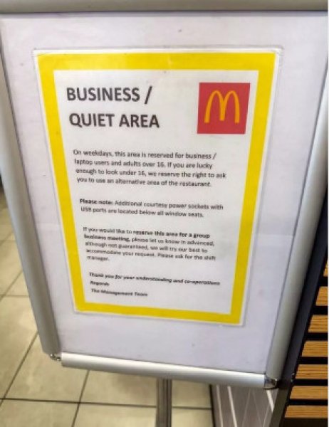 В ресторане установили новое объявление, которое четко запрещает лицам до 16 лет находиться в специально выделенной части помещения. В сообщении указано, что в будни эта зона предназначена только для взрослых пользователей ноутбуков и людей, которым нужна спокойная среда для работы или учебы. Указано также, что посетителей, которые выглядят моложе определенного возраста, могут попросить покинуть эту часть ресторана.