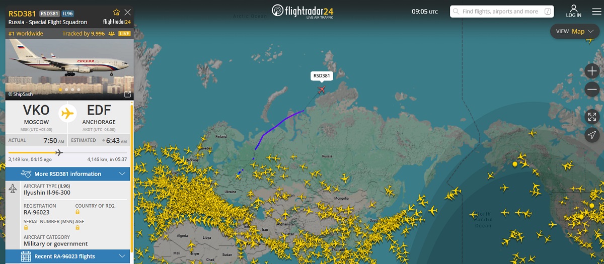 Самолет с регистрационным номером RA-96023 прямо в эти минуты держит курс в Анкоридж, Аляска. Вероятно, на борту находится российский президент Владимир Путин.