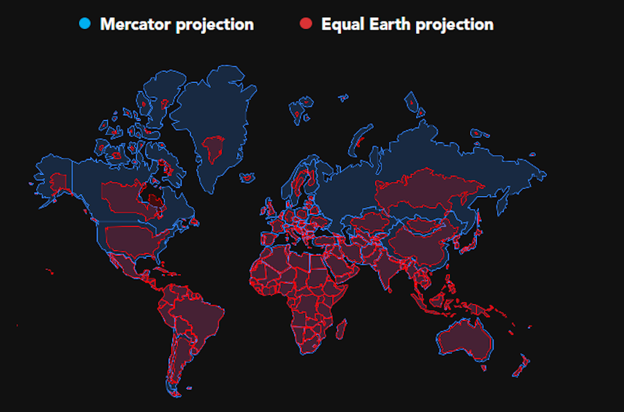 Проекция, созданная в XVI веке фламандским картографом Герардусом Меркатором для навигации, искажает размеры континентов, увеличивая Северную Америку и Гренландию, одновременно уменьшая Африку и Южную Америку, пишет агентство Reuters.