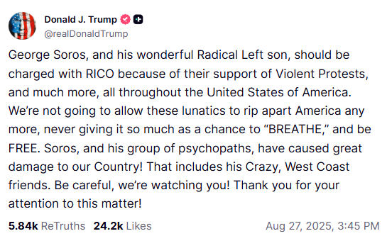 Американский президент написал 27 августа в собственной соцсети Truth Social, что Соросы должны быть осуждены по закону о борьбе с организованной преступностью — RICO. По его словам, миллиардер и его сын финансируют в Штатах насильственные протесты.