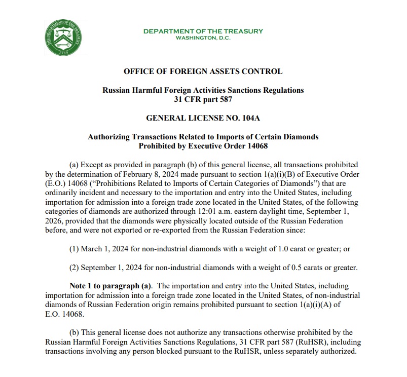 Министерство финансов США обнародовало общую лицензию №104A, которая позволяет осуществлять операции с импортом определенных категорий алмазов российского происхождения, запрещенных указом президента США №14068. Об этом свидетельствует документ Управления по контролю за иностранными активами (OFAC) Минфина США.