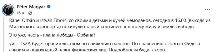 "Рахель Орбан и Иштван Тиборц со своими детьми и кучей чемоданов сегодня в 16:00 (выходя из Миланского аэропорта) покинули старый континент к новому миру и земле свободы. Это уже часть "плана победы" Орбана?" – пишет он.