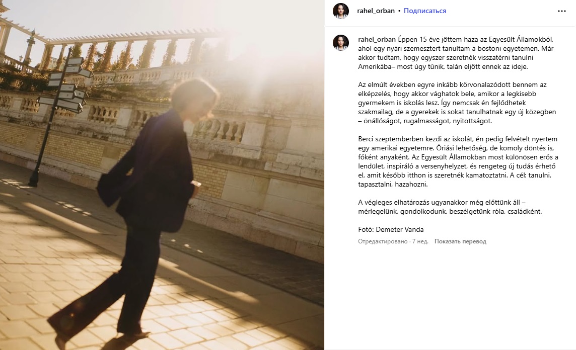 В начале июля Рахель Орбан написала в Instagram, что ее приняли в американский университет, и что она и ее муж рассматривают переезд на 2025/2026 в США. По ее словам, она что хотела вернуться в Америку почти 15 лет, поскольку ранее отучилась семестр в Бостонском университете.