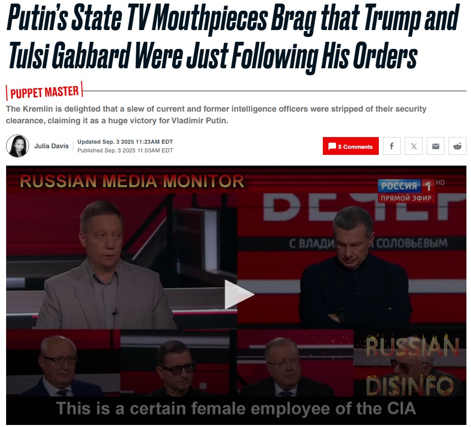 Кремлевские пропагандисты утверждают, что директор Национальной разведки Тулси Габбард внезапно лишила 37 действующих и бывших сотрудников ЦРУ допуска к секретной информации в результате личной встречи президента Владимира Путина с президентом Дональдом Трампом на Аляске в прошлом месяце.