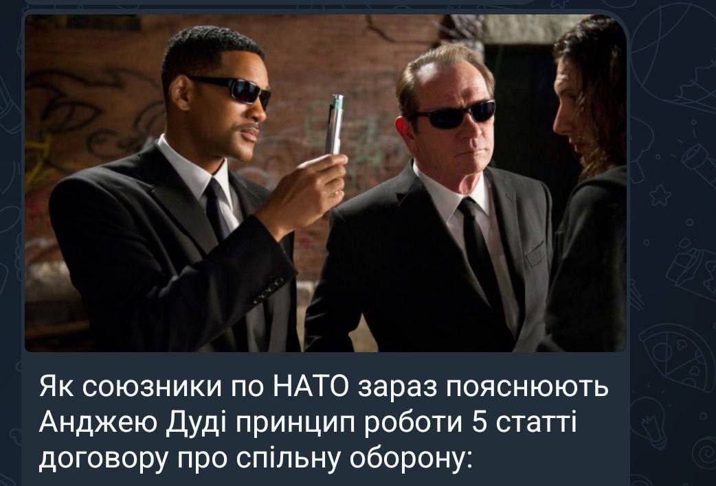 Больше всего мемов в сети касаются НАТО и принципа действия 5-й статьи договора о коллективной обороне. Для иллюстрации пользователи использовали кадры из фильма "Люди в черном", где агенты в черных костюмах и солнцезащитных очках демонстрируют устройство для стирания памяти. В мемах эту сцену шутливо связывают с объяснением Анджею Дуде работы статьи 5. Также в юмористической форме показан контраст между ожиданием и реальностью: сначала Польша думает, что воспользуется статьей для защиты, а в итоге — страна просит передать обратно Украине системы ПВО.