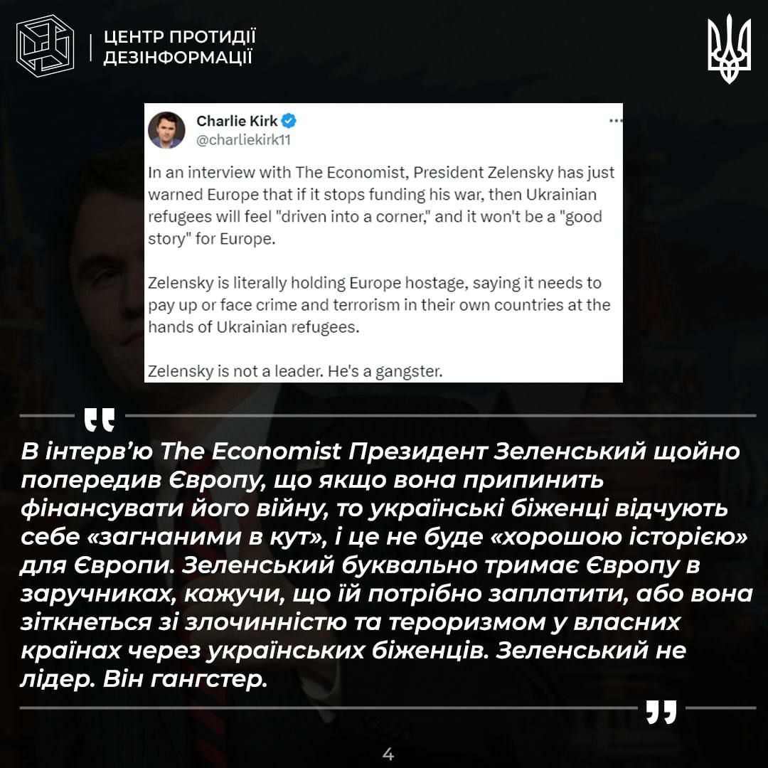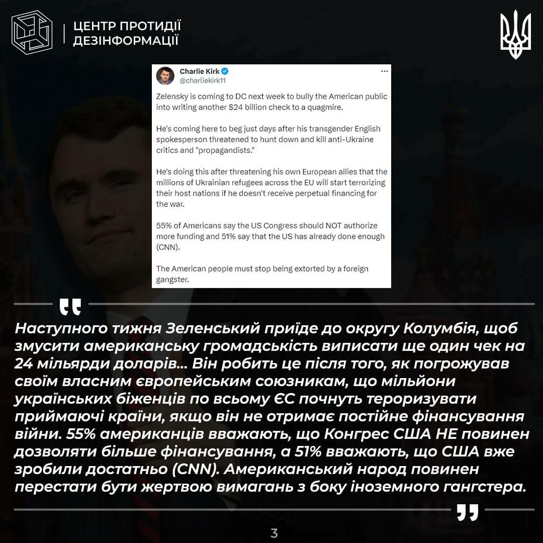 В то же время, как сообщил украинский журналист Андрей Цаплиенко, Чарли Кирк называл восточную часть Украины "исторически российской территорией", а Зеленского — "незаконно избранным президентом".
