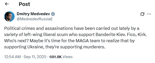 "Политические преступления и убийства в последнее время совершают различные леволиберальные подонки, которые поддерживают бандеровский Киев. Фицо, Кирк. Кто следующий? Возможно, команде MAGA пора осознать, что, поддерживая Украину, они поддерживают убийц", — написал Медведев.