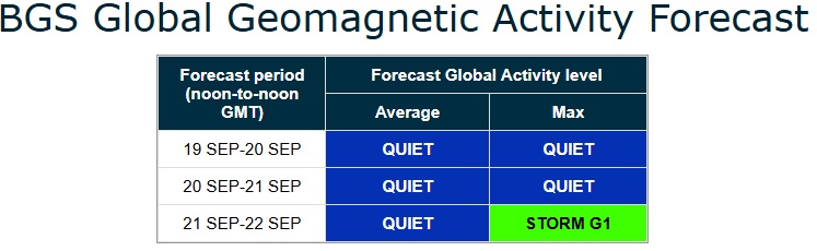 О том, что 21 сентября Землю будет штормить магнитная буря, сообщает и Британская геологическая служба. По ее данным, на нашу планету обрушится высокоскоростной поток из корональной дыры. Ожидается, что это приведет к некоторым активным периодам с небольшой вероятностью отдельных периодов магнитной бури уровня G1.