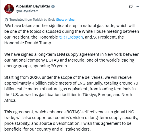 Согласно обнародованной информации, начиная с 2026 года, в рамках поставок Турция будет получать около 4 миллиардов кубометров СПГ ежегодно, что в общей сложности составляет около 70 миллиардов кубометров природного газа, с погрузочных терминалов в США, а также с газификационных установок в Турции, Европе и Северной Африке.