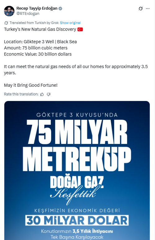 По словам президента Турции Реджепа Тайипа Эрдогана этого хватит, чтобы удовлетворить потребности всех домохозяйств в стране в течение 3,5 лет.