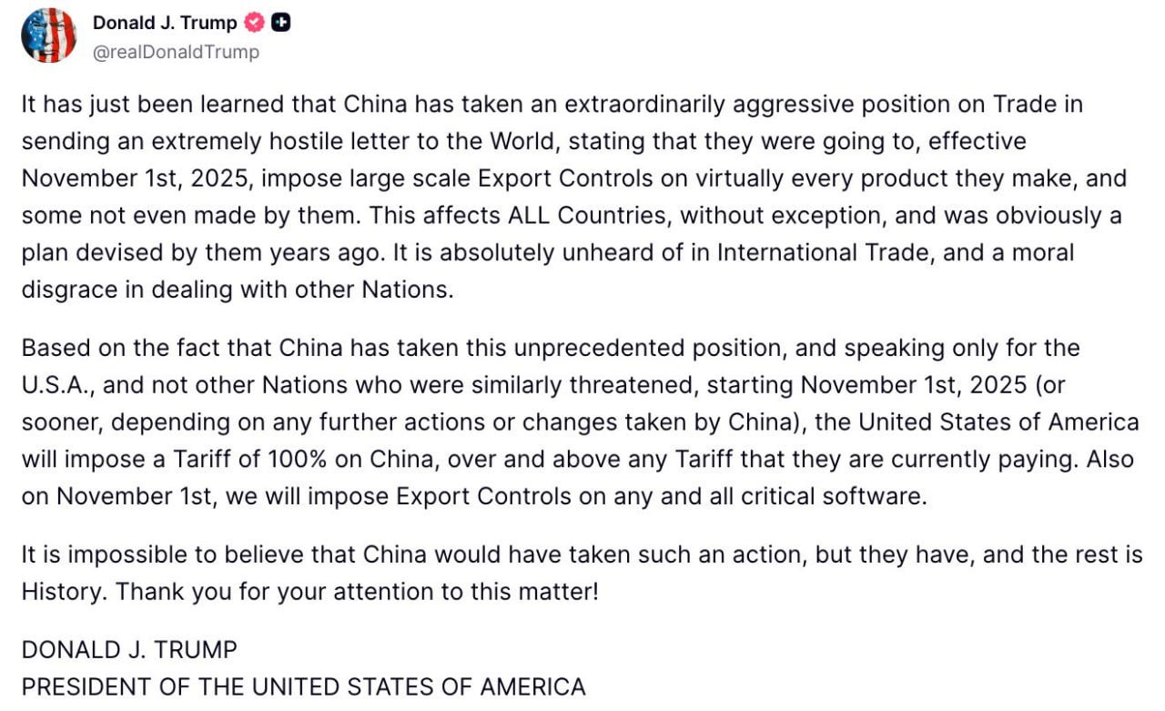 "С 1 ноября 2025 года (или раньше, в зависимости от дальнейших действий или изменений со стороны Китая) Соединенные Штаты Америки введут 100-процентный тариф на Китай, сверх любого тарифа, который они платят сейчас. Также 1 ноября мы введем экспортный контроль на все критически важное программное обеспечение", — написал Трамп.