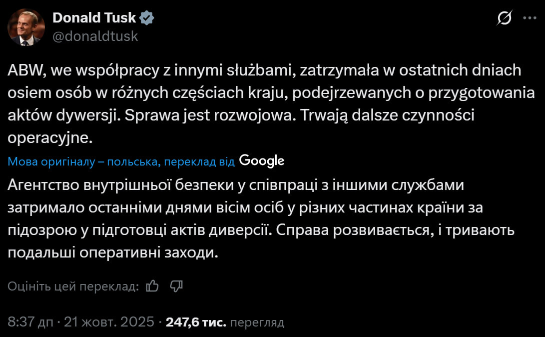 Стоит заметить, что 21 октября премьер-министр Польши Дональд Туск сообщил, что агентство внутренней безопасности вместе с другими службами провело операцию против группы лиц, которые готовили диверсии на территории страны. По данным RMF24, Мазовецкое отделение Национальной прокуратуры расследует деятельность российских спецслужб против Польши и союзников ЕС.