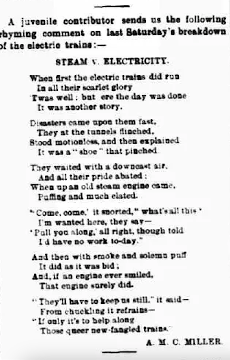 "Молодой автор прислал нам следующий рифмованный комментарий относительно поломки электрических поездов в минувшую субботу", — написали тогда в газете.