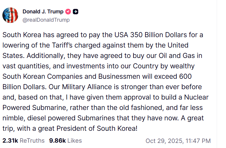 "Южная Корея согласилась выплатить США 350 миллиардов долларов в обмен на снижение таможенных пошлин, взимаемых с нее Соединенными Штатами", — написал Трамп в своей соцсети Truth Social.