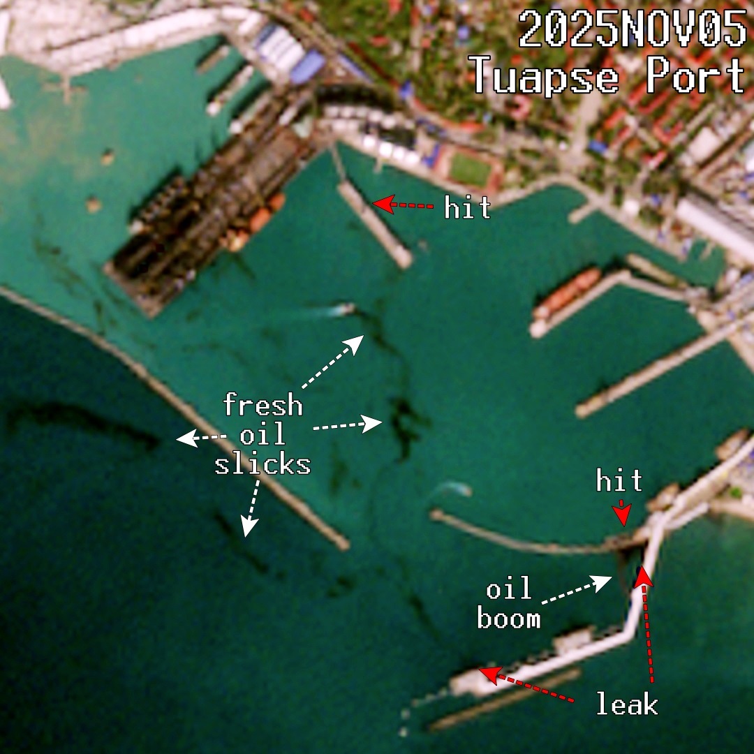 По данным, по состоянию на 5 ноября все суда отвели от причалов и поставили на якорь. А OSINT-исследователь Том Байк обнаружил новые спутниковые снимки, на которых видно свежие разливы нефти в порту — то есть, утечка продолжается.