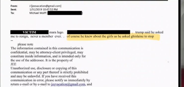 В электронном письме, отправленном Максвелл в 2011 году, Эпштейн заявил, что Трамп "провел несколько часов" с человеком, которого комитет считает жертвой.