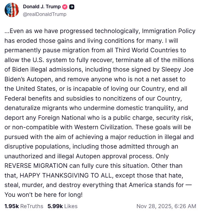 "Я навсегда остановлю миграцию из всех стран "третьего мира", чтобы система США могла полностью восстановиться", — пишет президент США.