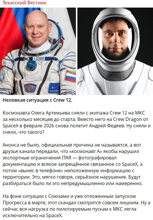"На фоне ситуации с "Союзами" и уже отложенным запуском "Прогресса" в марте, этот скандал смотрится совсем лишним. Ну а сейчас вся нагрузка по пилотируемым пускам к МКС легла исключительно на SpaceX", – отметил эксперт.