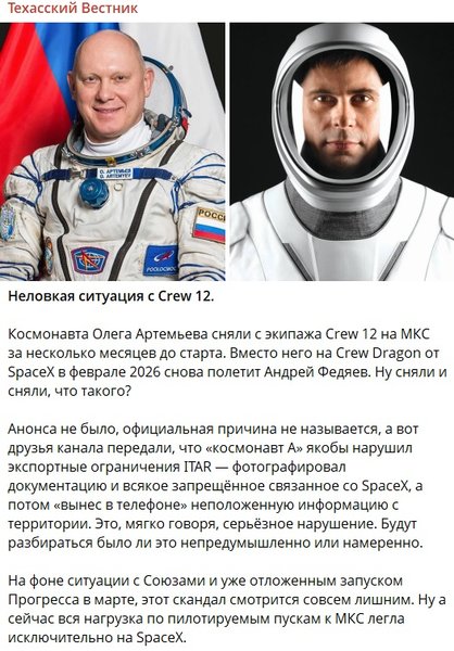 "Мои контакты подтверждают, что факт нарушения был, и запущена межведомственная проверка. Снятие с полета за два с половиной месяца до миссии без внятного объяснения причин — это скорее косвенный признак, но показательный. Представить себе ситуацию, в которой опытный космонавт может непреднамеренно допустить такое грубое нарушение, очень трудно", – отметил он.