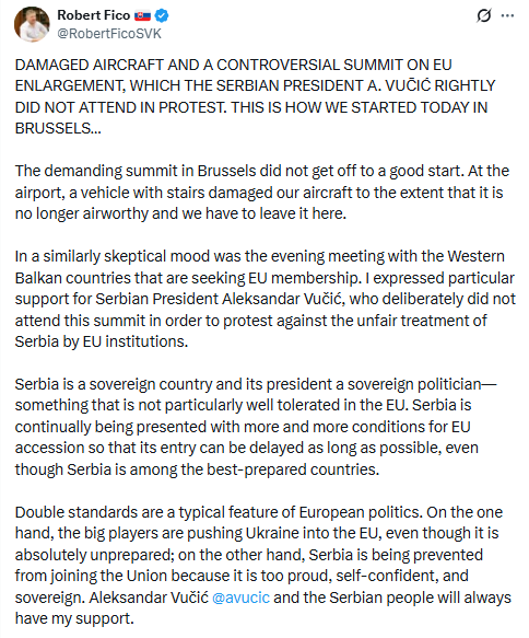 "Двойные стандарты являются типичной чертой европейской политики. С одной стороны, крупные игроки толкают Украину в ЕС, хотя она совершенно не готова к этому; с другой стороны, Сербии мешают присоединиться к Союзу, потому что она слишком гордая, уверенная в себе и суверенная", — говорится в заметке Фицо.