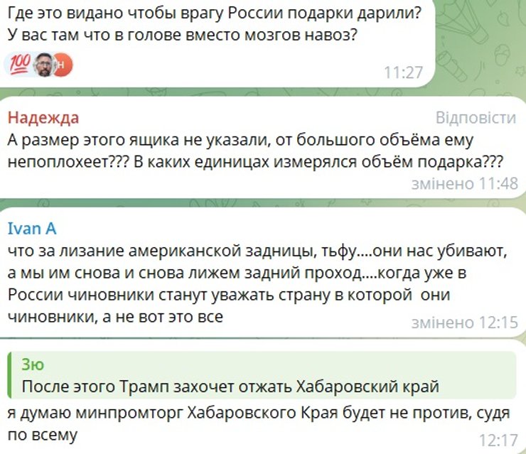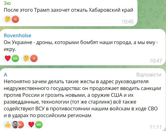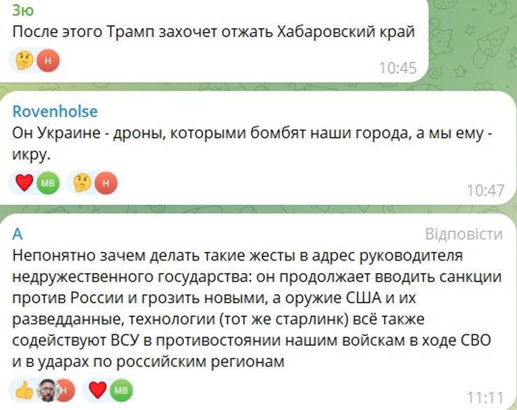 "Где это видано чтобы врагу России подарки дарили? У вас там что в голове вместо мозгов навоз?", "Он Украине — дроны, которыми бомбят наши города, а мы ему – икру", "После этого Трамп захочет отжать Хабаровский край", "Непонятно зачем делать такие жесты в адрес руководителя недружественного государства: он продолжает вводить санкции против России и грозить новыми, а оружие США и их разведданные, технологии (тот же старлинк) все также содействуют ВСУ в противостоянии нашим войскам в ходе СВО и в ударах по российским регионам", – негодуют под постом.