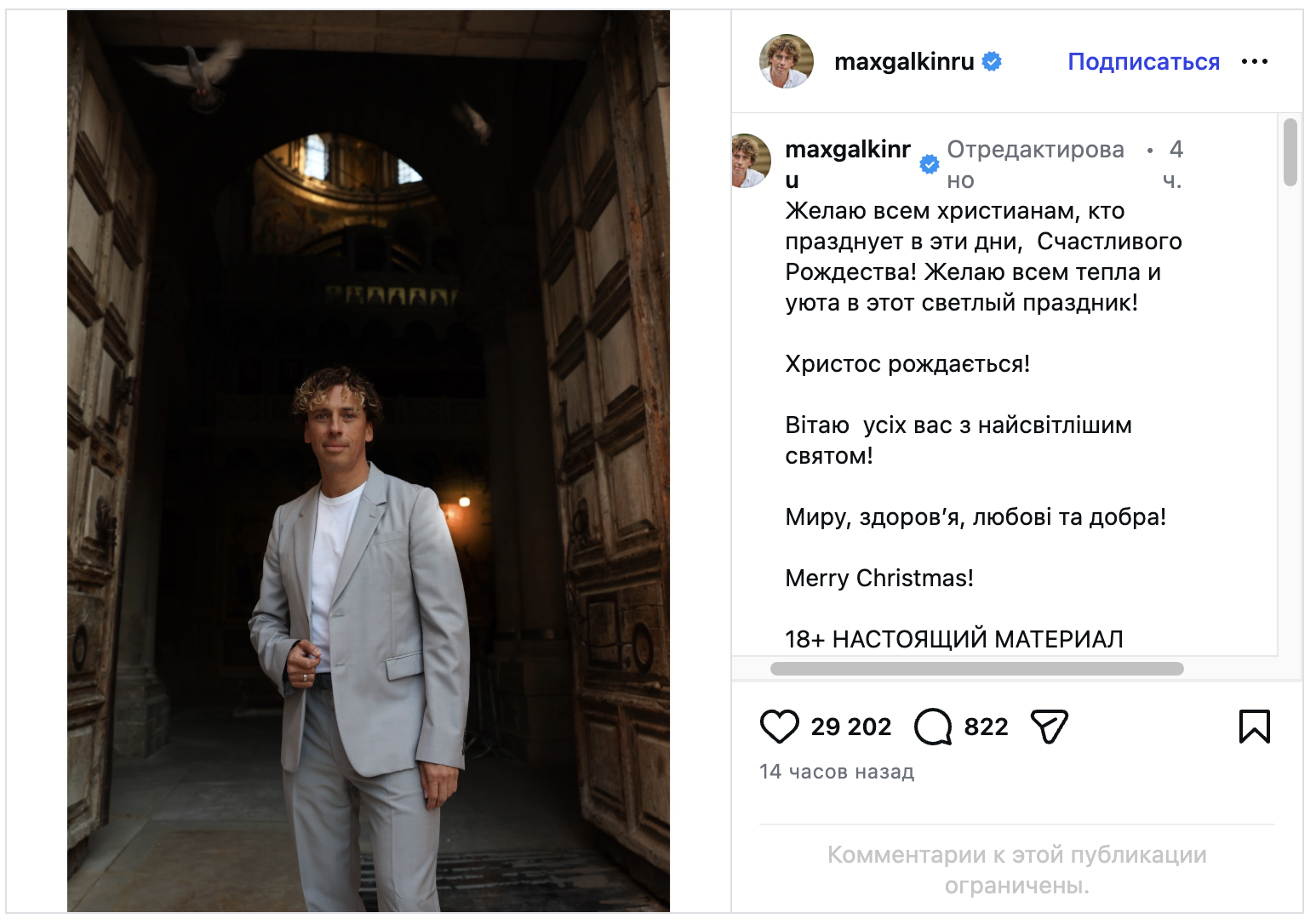 Соответствующее сообщение Галкин опубликовал в своем Instagram в день праздника. В начале он поздравил всех христиан, которые отмечают Рождество в эти дни.