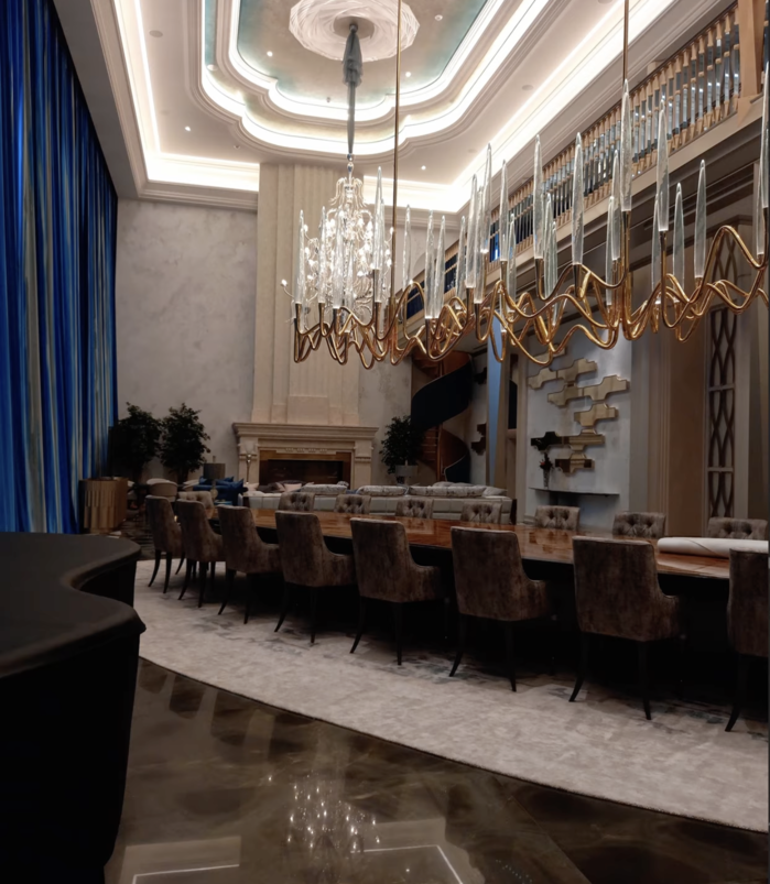 Ключевым подрядчиком была компания "Кредо", которая ранее уже отвечала за строительство как официальных, так и скрытых резиденций Путина. Главный дом поражает роскошью: комнаты отделаны мрамором и золотыми деталями, а один только кран в ванной с цветочными элементами стоит более 2,8 млн рублей, и таких в помещении — 15 элементов, на общую сумму более 11 миллионов. В другой ванной, которая, вероятно, обустраивалась уже как мужская, вместо цветов — драконы. Набор фурнитуры там обошелся в 11,2 миллиона.