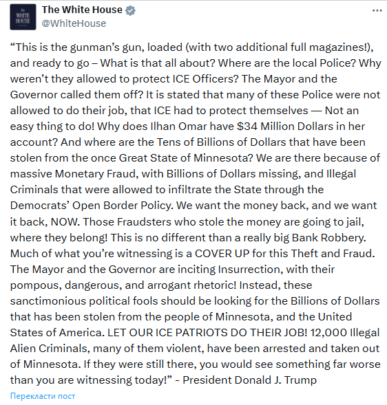 "Это пистолет стрелка, заряженный (с двумя дополнительными полными магазинами!) и готовый к стрельбе — что это вообще такое? Где местная полиция? Почему им не разрешили защищать сотрудников ICE? Мэр и губернатор отозвали их? Отмечается, что многим из этих полицейских не позволили выполнять свою работу, что ICE должна была защищать себя — нелегко это сделать!", — цитирует Белый дии заявление Трампа.