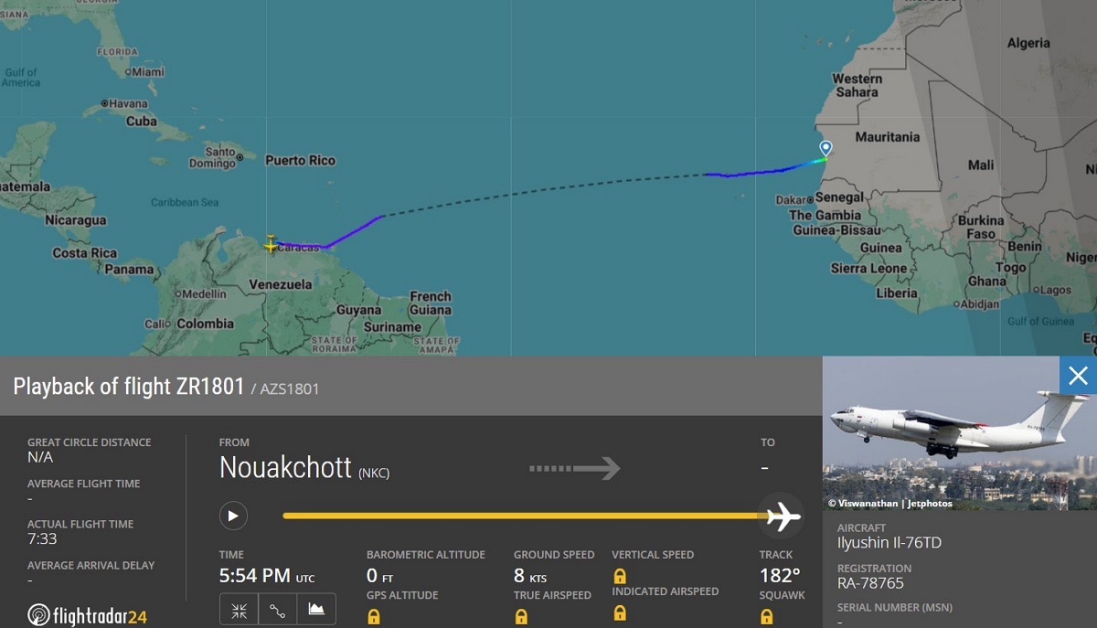 Ранее этот же Ил-76, находящийся под санкциями США, летал в Венесуэлу накануне военной операции Пентагона, которая закончилась захватом Николаса Мадуро.