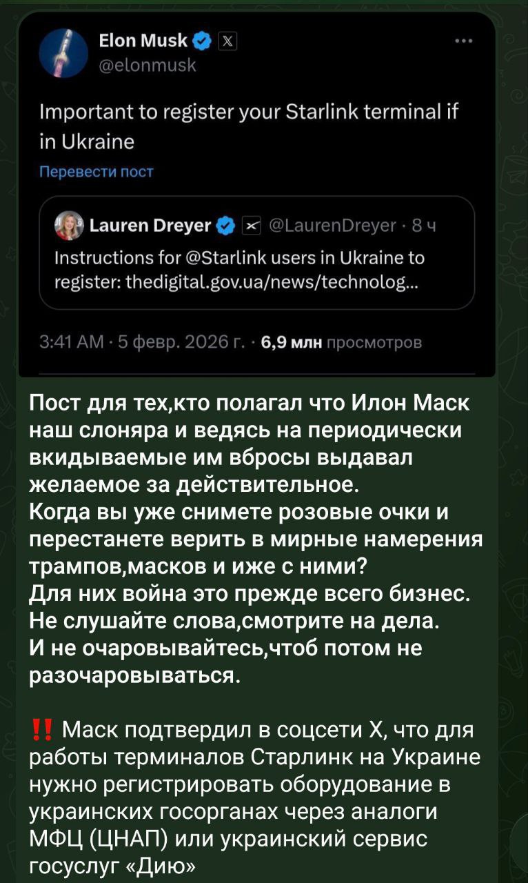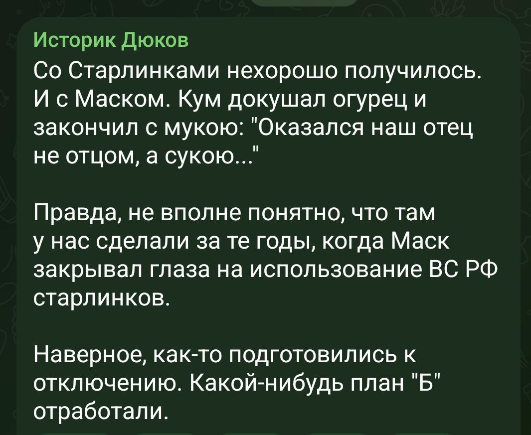 Стоит отметить, что угрожая видимо ракетным ударом по заводам Маска, производящим Starlink, так как российские дроны до США не долетят, Соловьев прямо угрожает США.