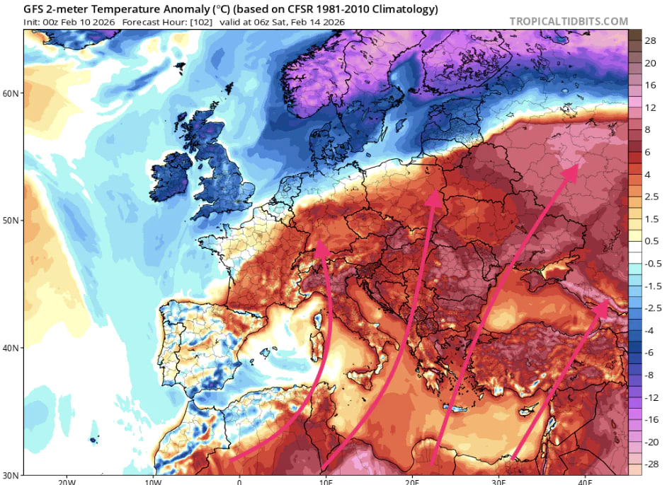 В течение второй декады февраля ожидаются снег, мокрый снег с переходом в дождь и морось, а на дорогах возможно образование гололеда. Местами туманы и сильный южный ветер до 15-17 м/с будут добавлять сложности погодным условиям. Повышение температуры будет способствовать активному таянию снежного покрова, который во многих областях может исчезнуть уже через несколько дней, кроме севера, востока и Карпат.