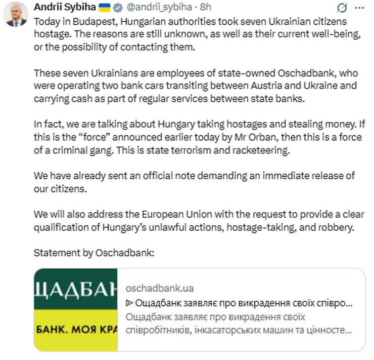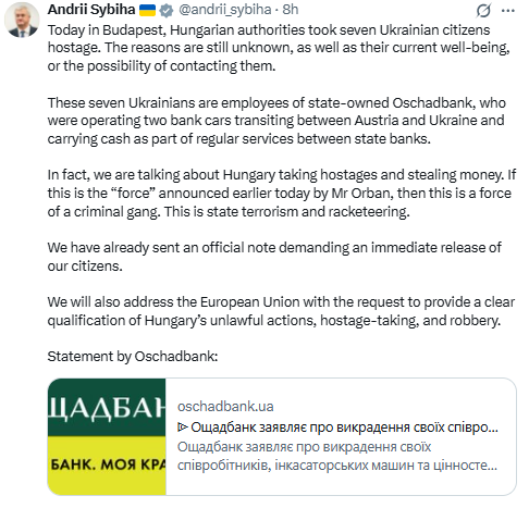 На захват инкассаторов отреагировали и в "Ощадбанке", и в МИД". Глава внешнеполитического ведомства Украины Андрей Сибига назвал случившееся "государственным терроризмом и рэкетом".
