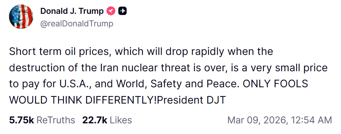 Рост цен на нефть до более 100 долларов за баррель глава Белого дома считает ожидаемым и не видит в этом проблемы, поскольку повышение считает "краткосрочным". Об этом Дональд Трамп написал 9 марта на своей странице в соцсети Truth Social.