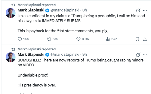 "Я настолько уверен в своих утверждениях о том, что Трамп — педофил, что призываю его и его адвокатов немедленно подать на меня в суд. Это расплата за комментарии о 51-м штате, ты свинья".